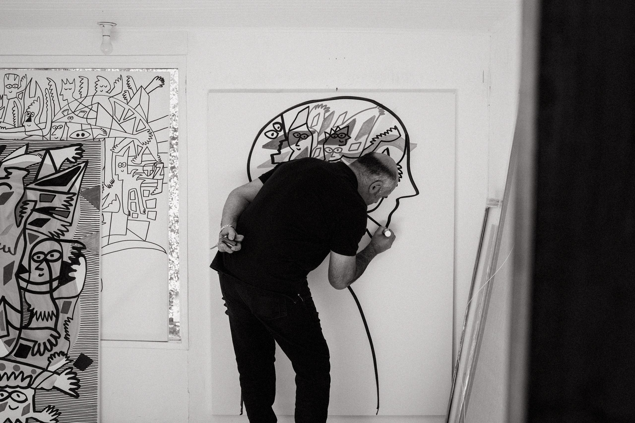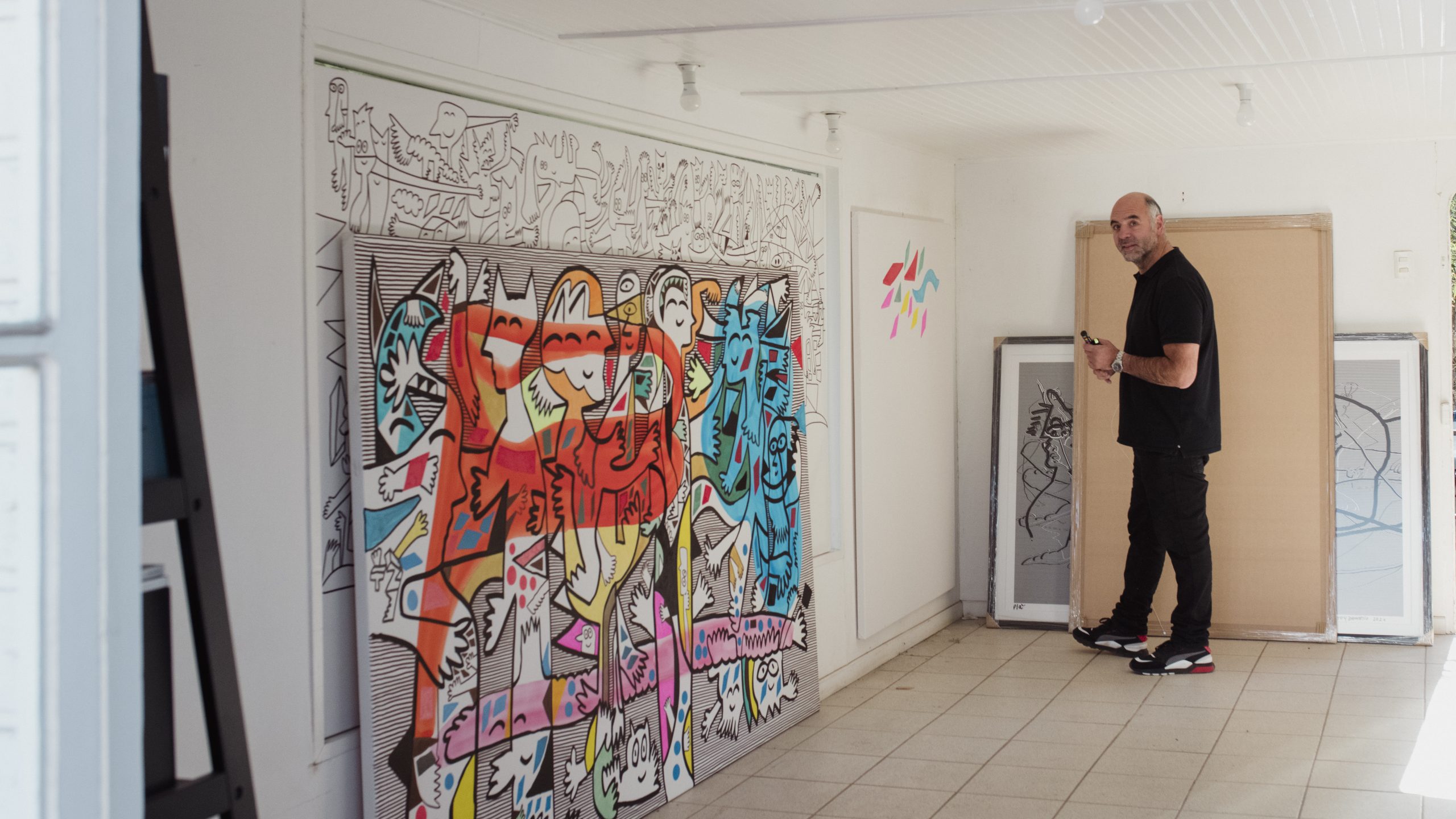Inspirado por la energía del trazo libre y el caos ordenado de la línea, el artista combina geometrías dinámicas, personajes expresivos y una paleta vibrante. Sus obras mezclan humor, crítica y abstracción, recordando a los grandes del arte moderno, pero con una voz propia llena de ritmo visual y movimiento.