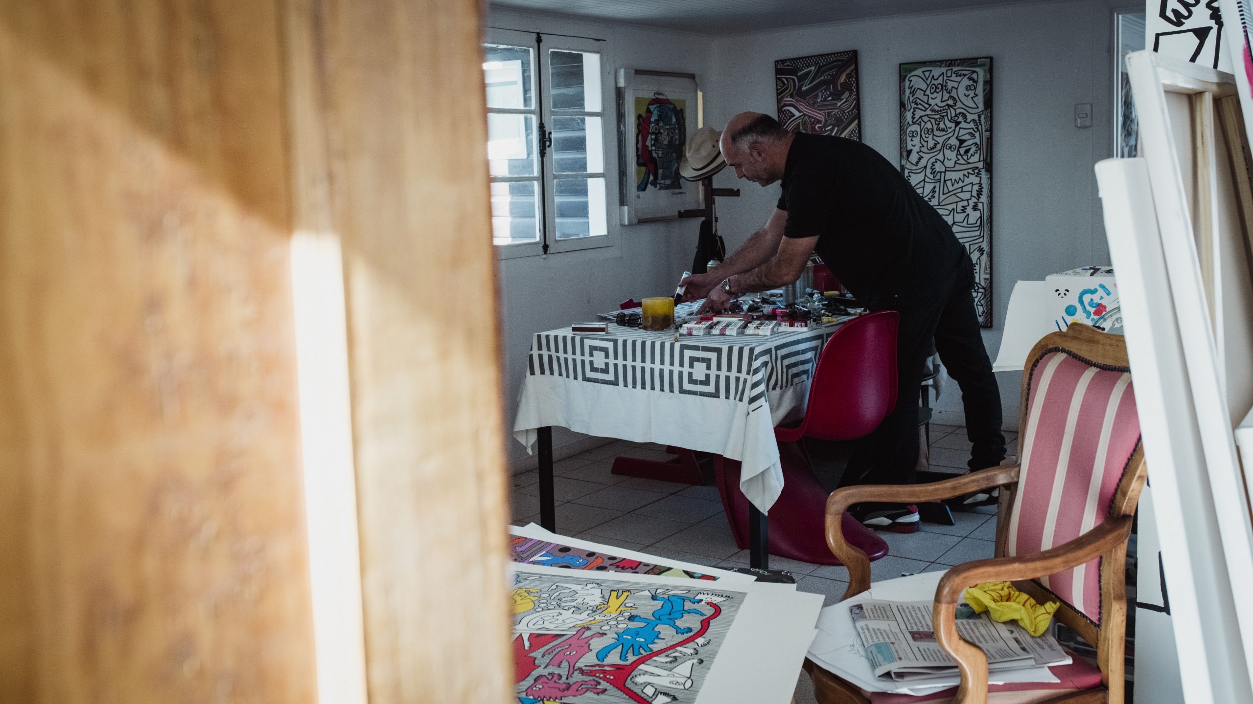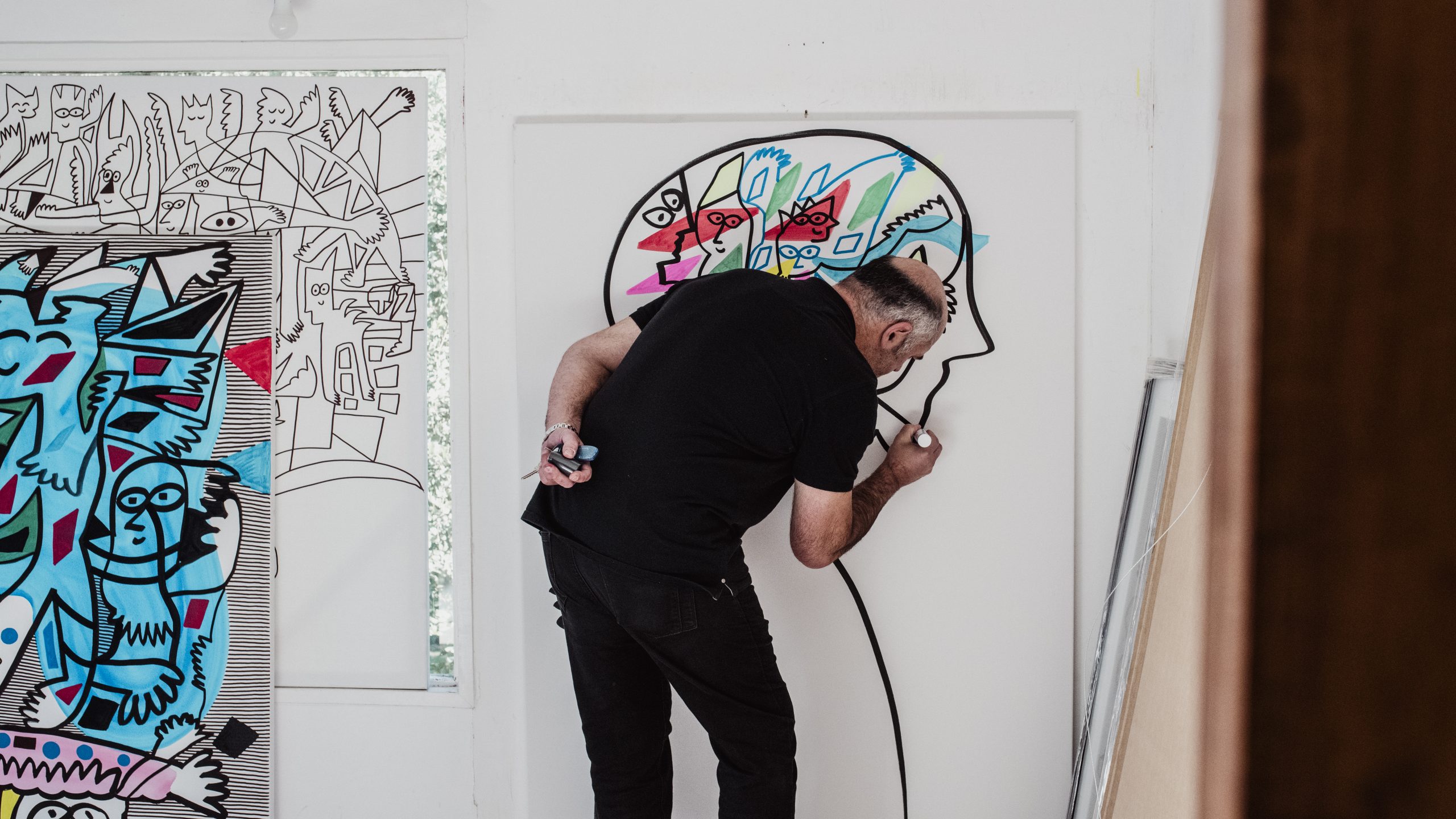 Sus trabajos hoy no sólo están colgados en las paredes y los muros, también cuelgan de atriles que levitan, en objetos de consumo, autos, murales, bebidas, cervezas, piscos, libros, revistas, zapatos, ropa, estacionamientos, baños, galerías, museos, colecciones privadas, bancos de plaza, esculturas, piscinas, escenografías, decoraciones, papeles murales, lámparas, cuadernos.